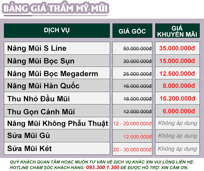 Thẩm mỹ viện Ngô Mộng Hùng không phải là địa điểm nâng mũi giá rẻ. Nhưng đảm bảo là trung tâm thẩm mỹ có mức chi phí vô cùng hợp lý với túi tiền các chị em. Đặc biệt, khi nâng mũi tại đây, bạn có cơ hội nhận được ưu đãi vô cùng hấp dẫn, lên đến 50%. Dưới đây là bảng giá chi phí nâng mũi tại thẩm mỹ viện chúng tôi. Mời bạn xem qua để nắm rõ chi tiết: